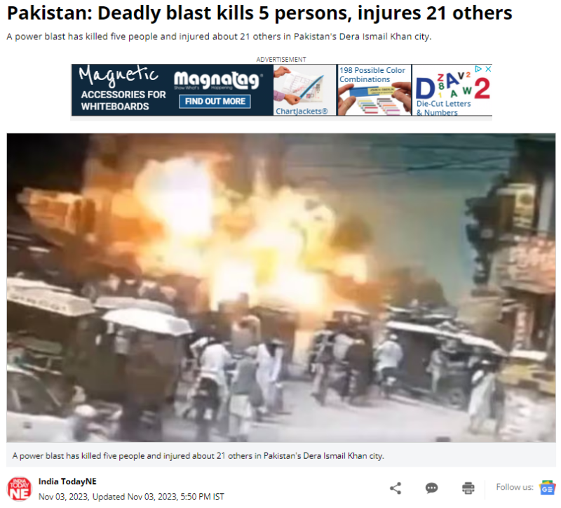 ইণ্ডিয়া টুডে নৰ্থইষ্ট তো ২০২৩ৰ ৩ নৱেম্বৰত একেটা ঘটনাৰ বাতৰি প্ৰচাৰ হৈছিল। বাতৰিটোৰ মতে পাখতুনখা প্ৰদেশৰ খাইবাৰত ইছমাইল খানৰ ডেৰাত সংঘটিত হৈছিল বিস্ফোৰণ। বোমাটো আৰক্ষীৰ বাহনৰ ওচৰৰ এখন মটৰ চাইকেলত সংস্থাপিত আছিল। বিস্ফোৰণৰ পাছত গুলীওৱাৰ শ্বও শুনা গৈছিল। বিল্ফোৰণৰ পাছত আৰক্ষী আৰু বোমা নিস্ক্ৰিয়কাৰীৰ দল ঘটনাস্থলীত উপস্থিত হৈছিল।