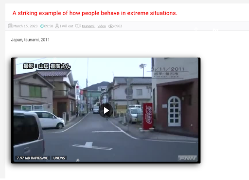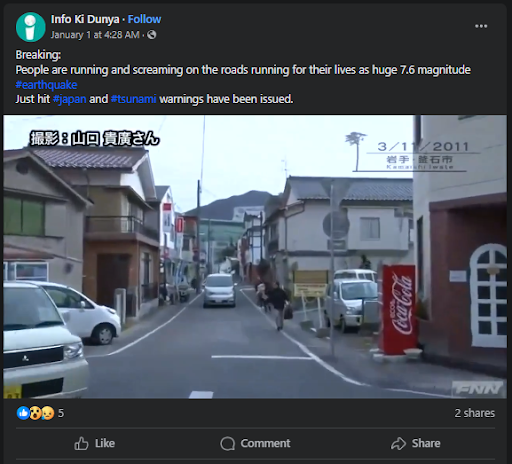 ২০২৪ৰ ১ জানুৱাৰীৰ দিনা জাপানত ৭.৫ ৰিখটাৰ স্কেলৰ এটা ধ্বংসাত্মক ভূমিকম্প ৰ ঘটনা সংঘটিত হয়। ইয়াৰ বাবেই ছুনামীৰ আশংকা সৃষ্টি হোৱাৰ লগতে বহু লোকৰ মৃত্যু আৰু সম্পত্তি ধ্বংস হয়। এনে সময়তে ছুনামীৰ সময়তে একাংশ লোকে নিজৰ জীৱন ৰক্ষাৰ বাবে হাহাকাৰ কি দৌৰা-দৌৰি কৰি থকা ভিডিও এটা সামাজিক মাধ্যমত ভাইৰেল হৈছে। বহুতে এয়া জাপানৰ শেহতীয়া ভূমিকম্পৰ সময়ৰ দৃশ্য বুলি দাবী কৰিছে।