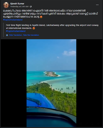 এজন ফেচৱুক ব্যৱহাকাৰীয়ে ভিডিওটো পোষ্ট কৰি কেপচনত লিখিছে লাক্ষাদ্বীপৰ আগাট্টী উপত্?কাত প্ৰথমবাৰ এৰ’প্লেন লেণ্ডিং, বিমান বন্দৰ আৰু ৰানৱে’ বিশ্ব মানৰ #ExplorIndianIsland