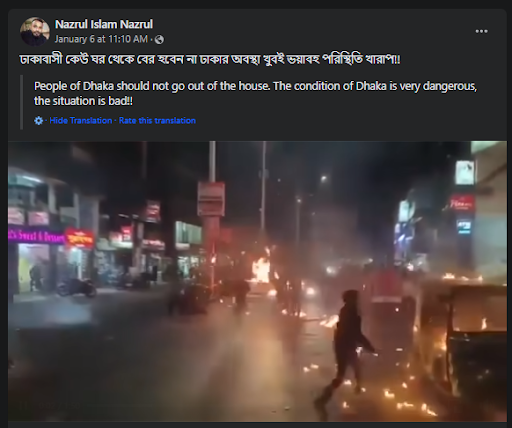 বাংলাদেশৰ শেহতীয়া নিৰ্দাচনত একেৰাহে চতুৰ্থ বাৰলৈ প্ৰধানমন্ত্ৰী শ্বেইখ হাছিনা ই জয়লাভ কৰে। এনে সময়তে দুৰ্বৃত্তই শিল দলিওৱা, গাড়ীত অগ্নিসংযোগ কৰা, বজাৰ লণ্ডভণ্ড কৰা এটা ভিডিও সামাজিক মাধ্যমত ভাইৰেল হৈছে। বহুতে দাবী কৰিছে যে এই ঘটনা নিৰ্বাচনৰ এদিন পূৰ্বৰ, ৭ জানুৱাৰী ২০২৪ৰ।