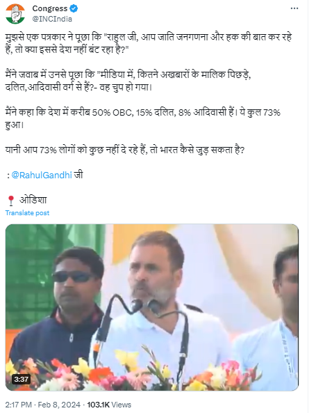 ভিডিওটোৰ কী ফ্ৰেমৰ ফটো ৰিভাৰ্ছ ইমেজ চাৰ্ছত দিয়াত আমি কংগ্ৰেছৰ X একাউণ্টত ইয়াৰ মূল ভিডিওটো লাভ কৰিলো। ভিডিওটোৰ সৈতে কেপচনত আছিল: এজন সাংবাদিকে মোক সুধিছিল, “ৰাহুলজী, আপুনি জাতিগত জনগণনা আৰু জাতিগত অধিকাৰৰ কথা কয়, এয়া দেশ ভাগ ভাগ কৰাৰ দৰে নহয়নে?” উত্তৰত মই তেওঁক প্ৰশ্ন কৰিছিলো, “সংবাদ মাধ্যমত, বাতৰি কাকতৰ মালকৰ ভিতৰত কিমান গৰাকী পিছপৰা শ্ৰেণীৰ, দলিত বা জনজাতীয়? – তেওঁ মনে মনে থাকিল। মই ক’লো আমাৰ দেশত প্ৰায় ৫০% অন্যান্য পিছ পৰা শ্ৰেণীৰ, ১৫% দলিত আৰু ৮% জনজাতীয় লোক আছে। এই সংখ্যা ৭৩% হয়। ইয়াৰ অৰ্থ আপোনালোকে ৭৩% লোকলৈ একো দিয়া নাই, তেন্তে ভাৰত কিদৰে এক হ’ব?