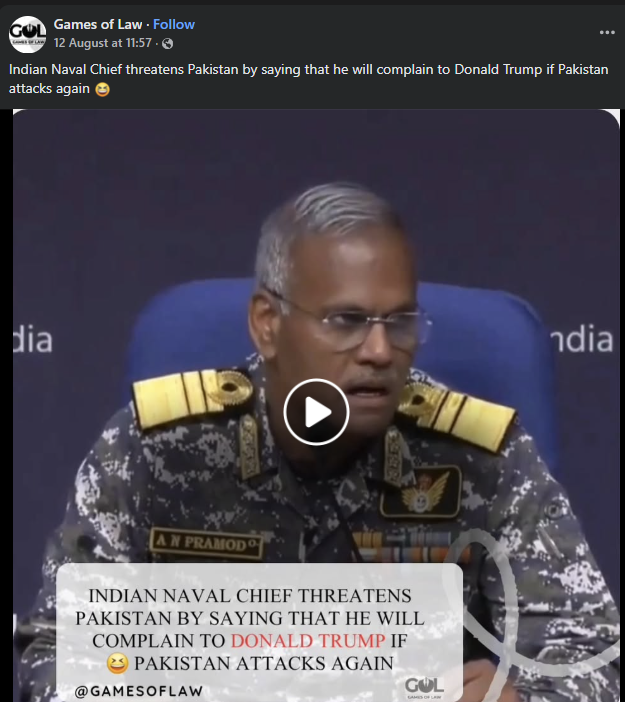 ভাৰতীয় নৌসেনাৰ নৌ অভযানৰ সঞ্চালক প্ৰধান (Director General of Naval Operations– DGNO), এ এন প্ৰমোদে সংবাদ মেলত ভাষণ দি থকা এটা ভিডিও সামাজিক মাধ্যমত ভাইৰেল হৈছে। ভাইৰেল ক্লিপটোত তেওঁক কোৱা শুনা গৈছে- যদিহে পাকিস্তানে ভাৰতৰ বিৰুদ্ধে কোনো ধৰণৰ পদক্ষেপ গ্ৰহণ কৰে, তেন্তে ভাৰতে ‘‘মাৰ্কিন ৰাষ্ট্ৰপতি ড’নাল্ড ট্ৰাম্পক অভিযোগ দিব।’’ বহুতে এই ভাষ্য সত্য বুলি দবী কৰিছে।