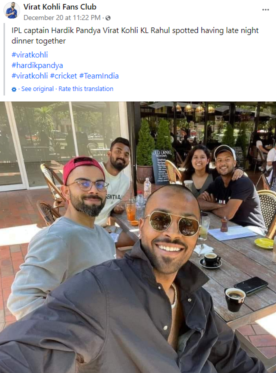 ഈ ചിത്രം ഫേസ്ബുക്കില് ഇങ്ങനെയൊരു കുറിപ്പോടെയാണ് പങ്കുവെച്ചിരിക്കുന്നത്: “आईपीएल के कप्तान हार्दिक पांड्या विराट कोहली केएल राहुल एक साथ लेट नाइट डिनर करते हुए नजर आए #viratkohli #hardikpandya #viratkohli #cricket #TeamIndia” (English version: see below.)