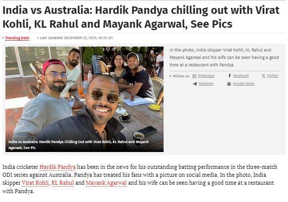 ഓസ്ട്രേലിയയ്ക്കെതിരായ മൂന്ന് മത്സര ഏകദിന പരമ്പരയിലെ പാണ്ഡ്യയുടെ മികച്ച പ്രകടനത്തെ ഉയർത്തിക്കാട്ടുന്ന, 2020 ഡിസംബർ 4-ലെ ഒരു ന്യൂസ് 18 ലേഖനം വൈറൽ ചിത്രവും ഉൾക്കൊള്ളുന്നു. ആ സമയത്ത്, വിരാട് കോഹ്ലി, കെഎൽ രാഹുൽ, മായങ്ക് അഗർവാൾ, ഭാര്യ എന്നിവരോടൊപ്പം ഒരു റെസ്റ്റോറന്റിൽ സ്വയം പ്രദർശിപ്പിക്കുന്ന ഒരു ചിത്രം പാണ്ഡ്യ ആരാധകരുമായി പങ്കിട്ടിരുന്നു.