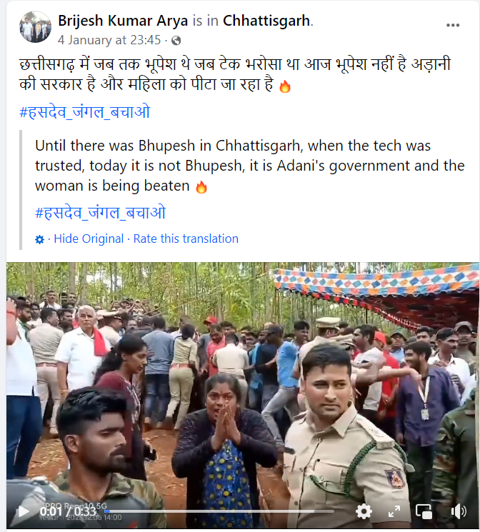 ভিডিওটি একটি ক্যাপশন সহ ফেসবুকে শেয়ার করা হয়েছে: “छत्तीसगढ़ में जब तक भूपेश थे जब टेक भरोसा था आज भूपेश नहीं है अड़ानी की सरकार है और महिला को पीटा जा रहा है #हसदेव_जंगल_बचाओ” (অনুবাদ: যতদিন ভূপেশ ছত্তিশগড়ে ছিলেন, প্রযুক্তি নির্ভর ছিল… আজ ভূপেশ নেই, আদানি সরকার এবং মহিলাকে মারধর করা হচ্ছে। #হসদেব_জঙ্গল_বাঁচাও)