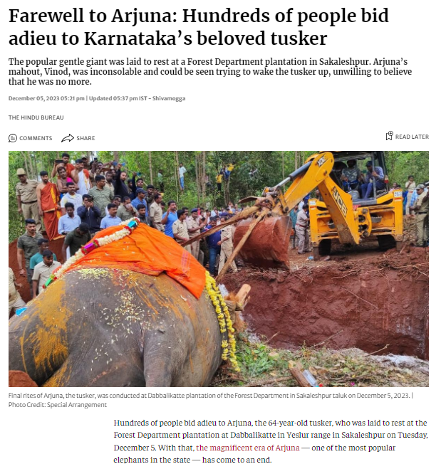 দ্য হিন্দু ওয়েবসাইটের প্রতিবেদন অনুসারে, ৫ ডিসেম্বর, ২০২৩ তারিখে অর্জুনের মৃত্যুর পরে বাসিন্দারা সরকারি অবহেলার অভিযোগ করে বন বিভাগের কাছে গিয়েছিলেন। তারা আরও দাবি করেছিল যে মহীশূরে শেষকৃত্য করা হবে, যেখানে অর্জুন দশেরা উৎসবে অংশ নিতেন।