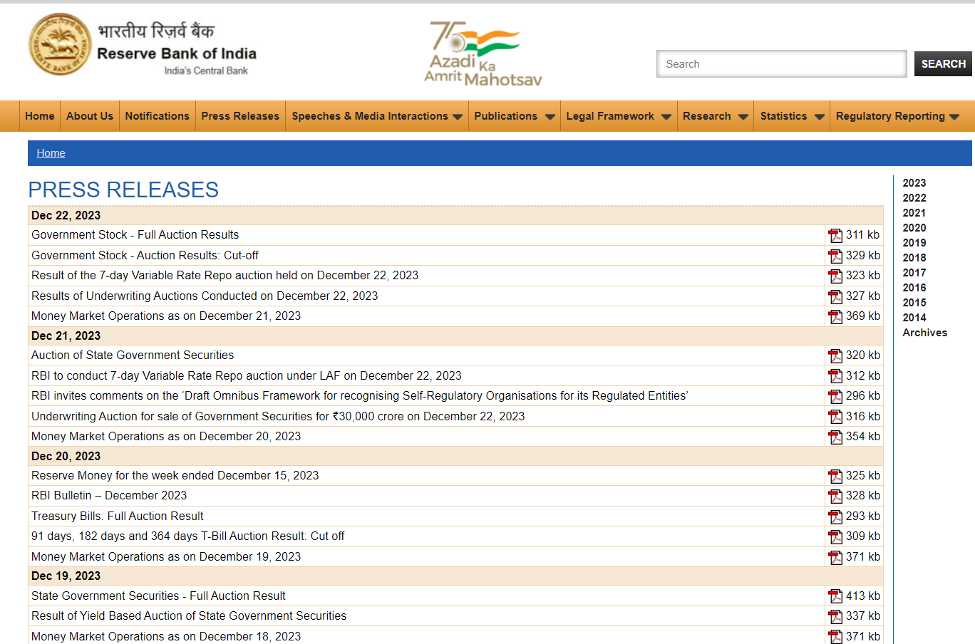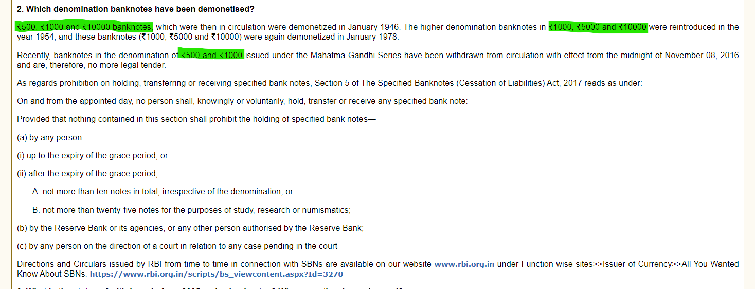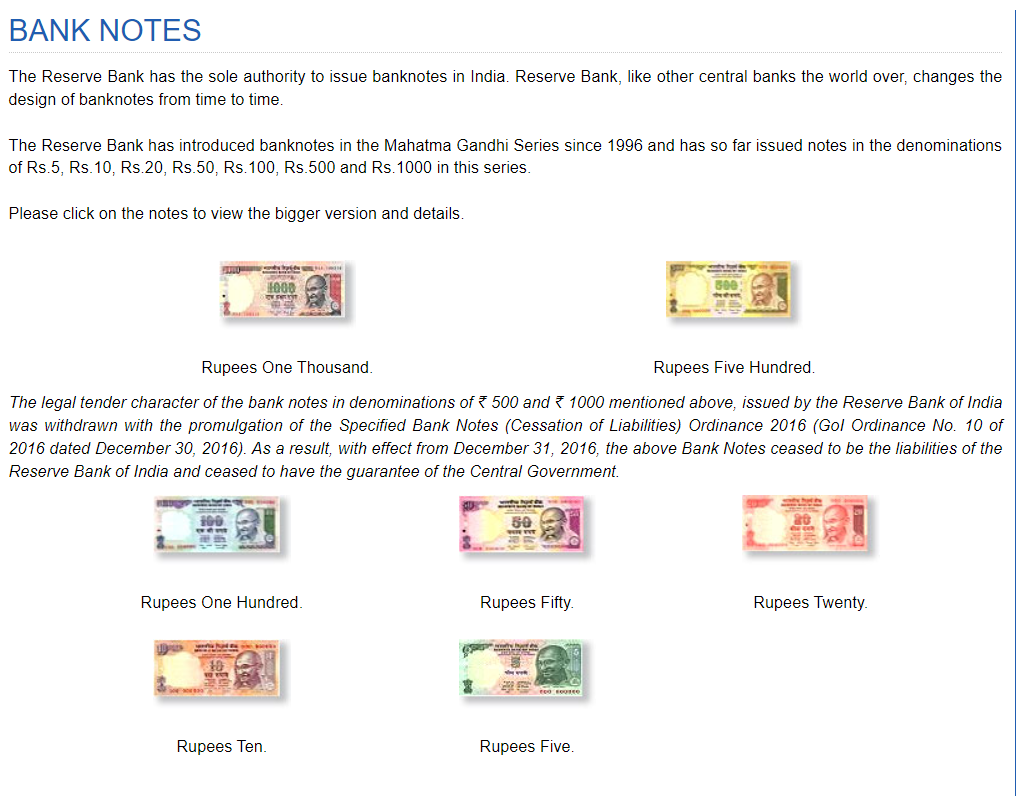 আরবিআই তার ওয়েবসাইটে ₹৫০০ এবং ₹১০০০ কারেন্সি নোটের ২০১৬ সালের বিমুদ্রাকরণের পরে বৈধ মুদ্রার নোটগুলির পুরনো সিরিজ নির্দিষ্ট করেছে।