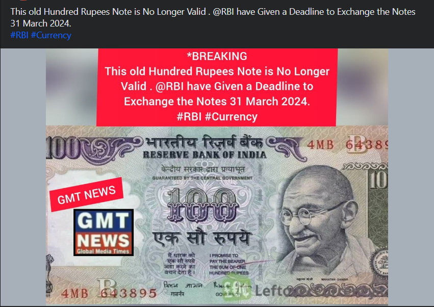 একটি সংবাদ প্রতিবেদন সোশ্যাল মিডিয়ায় ভাইরাল হয়েছে, যেখানে দাবি করা হয়েছে যে পুরানো ₹১০০ নোটটি আর আইনি টেন্ডার নয়, এবং রিজার্ভ ব্যাঙ্ক অফ ইন্ডিয়া (আরবিআই) নোট বদল করার সময়সীমা বেঁধে দিয়েছে।