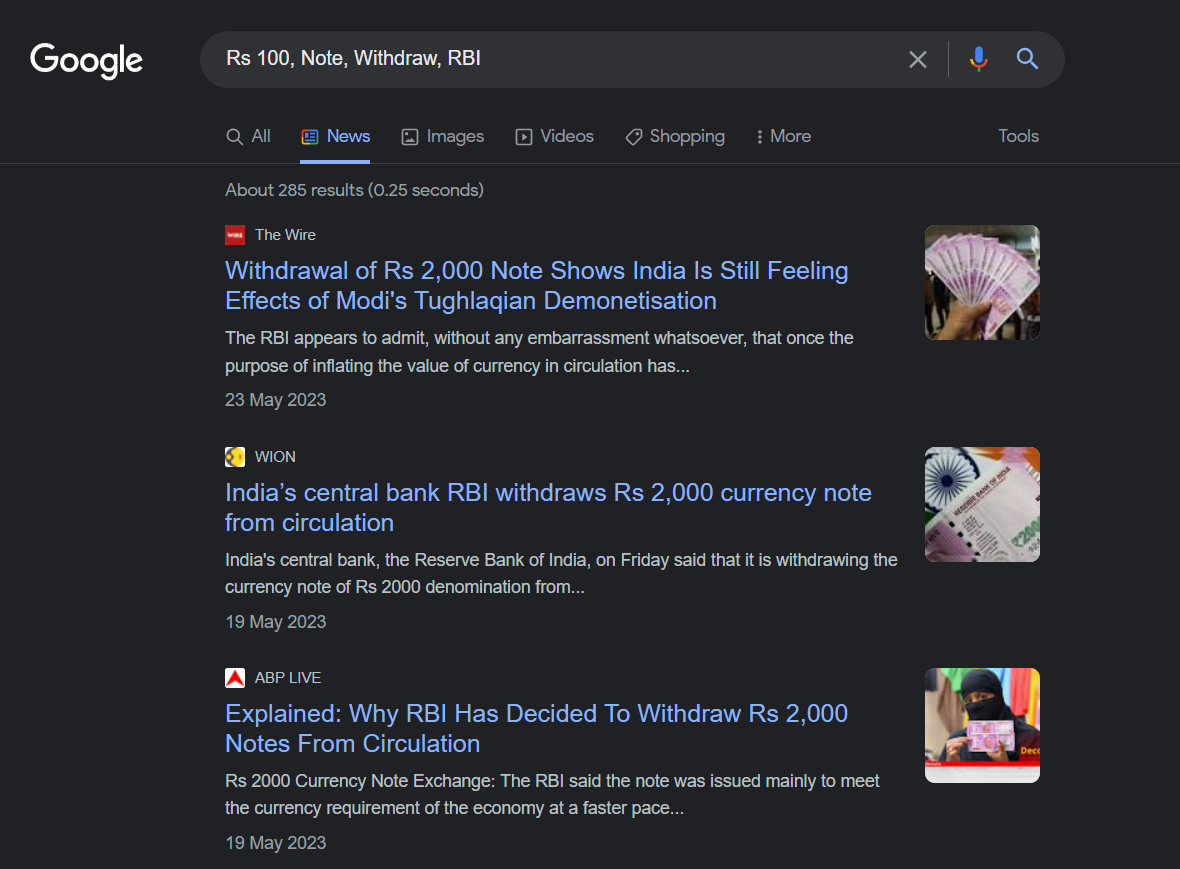 এমনকি প্রাসঙ্গিক গুগল কিওয়ার্ড দিয়েও আমাদের টিম আরবিআই–এর ₹১০০ কারেন্সি নোটের পুরানো সিরিজ প্রত্যাহার করার পরিকল্পনা সম্পর্কে কোনও বিশ্বাসযোগ্য তথ্য বা খবর খুঁজে পায়নি