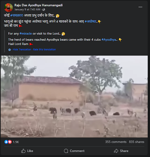 রাম মন্দির উদ্বোধনের জন্য একটি ভাল্লুক তার চারটি শাবক নিয়ে অযোধ্যায় পৌঁছেছে বলে দেখানো একটি ভিডিও সোশ্যাল মিডিয়ায় ভাইরাল হয়েছে। অনেক ব্যবহারকারী এই ভাল্লুককে রামায়ণের একটি পৌরাণিক প্রাণীর সঙ্গে সত্যিকারের সংযোগের সত্যতা বলে দাবি করেছেন।