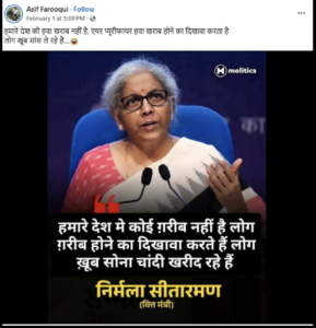 কেন্দ্রীয় অর্থমন্ত্রী নির্মলা সীতারামনের একটি গ্রাফিক সোশ্যাল মিডিয়ায় ভাইরাল হয়েছে। ১ ফেব্রুয়ারি, ২০২৬ তারিখে সীতারামন লোকসভায় ২০২৬-২০২৭ সালের কেন্দ্রীয় বাজেট উপস্থাপনের পর এই গ্রাফিকটি প্রকাশিত হয়। ভাইরাল গ্রাফিকের লেখাটিতে অর্থমন্ত্রীর এমন একটি বিবৃতির কথা উল্লেখ করা হয়েছে যেখানে দাবি করা হয়েছে যে তিনি বলেছেন, “আমাদের দেশে কোনও দরিদ্র মানুষ নেই। লোকেরা দরিদ্র হওয়ার ভান করে এবং লোকেরা প্রচুর সোনা ও রূপা কিনছে।”